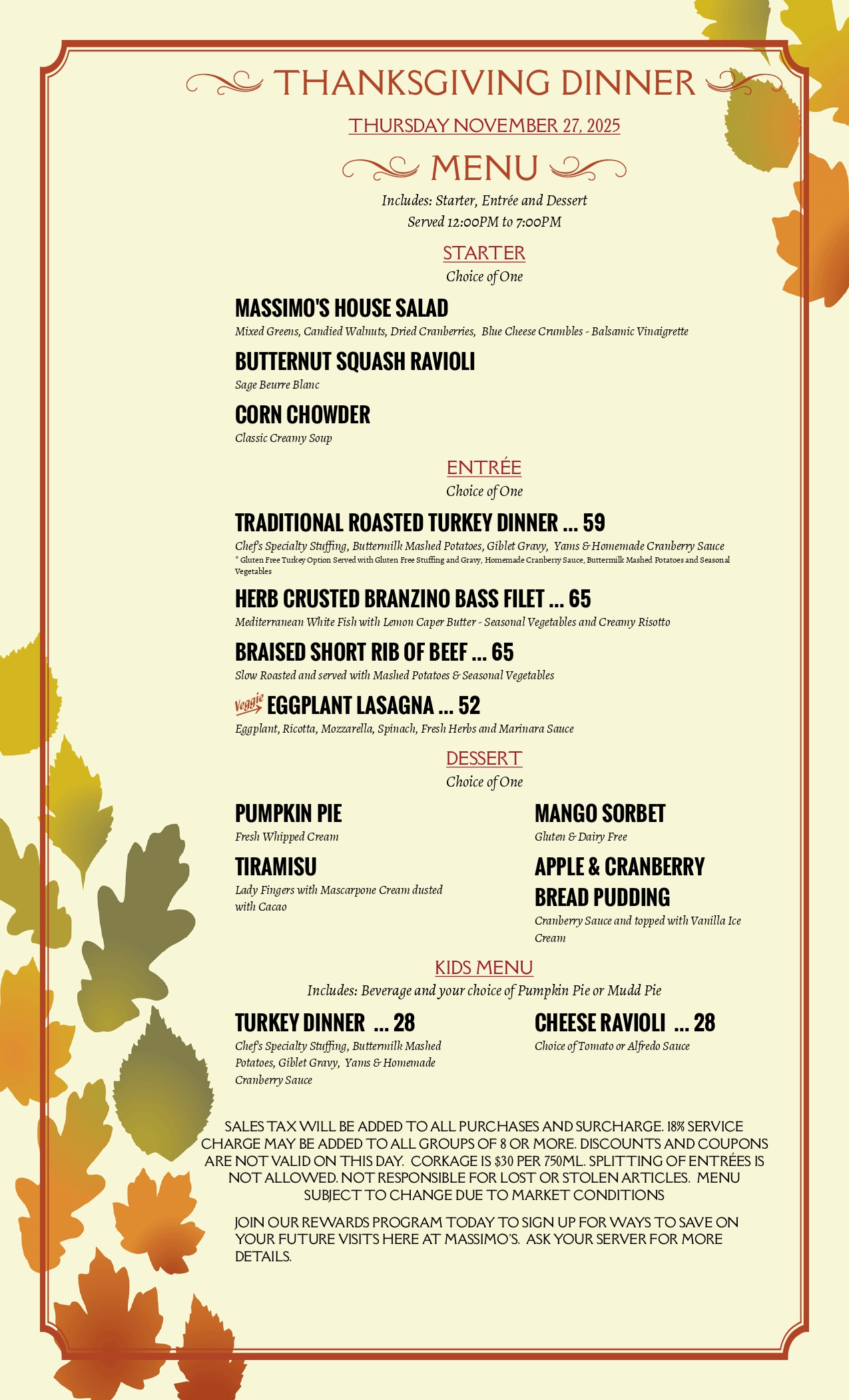 Thanksgiving Dinner at Massimo’s Thursday, November 27th | 12:00 PM – 7:00 PM Celebrate Thanksgiving with family and friends at Massimo’s. Enjoy a three-course menu featuring traditional favorites like Roasted Turkey with all the trimmings, Braised Short Rib, Herb-Crusted Branzino, and Eggplant Lasagna, plus a selection of decadent desserts including Pumpkin Pie and Tiramisu Takeout options also available.